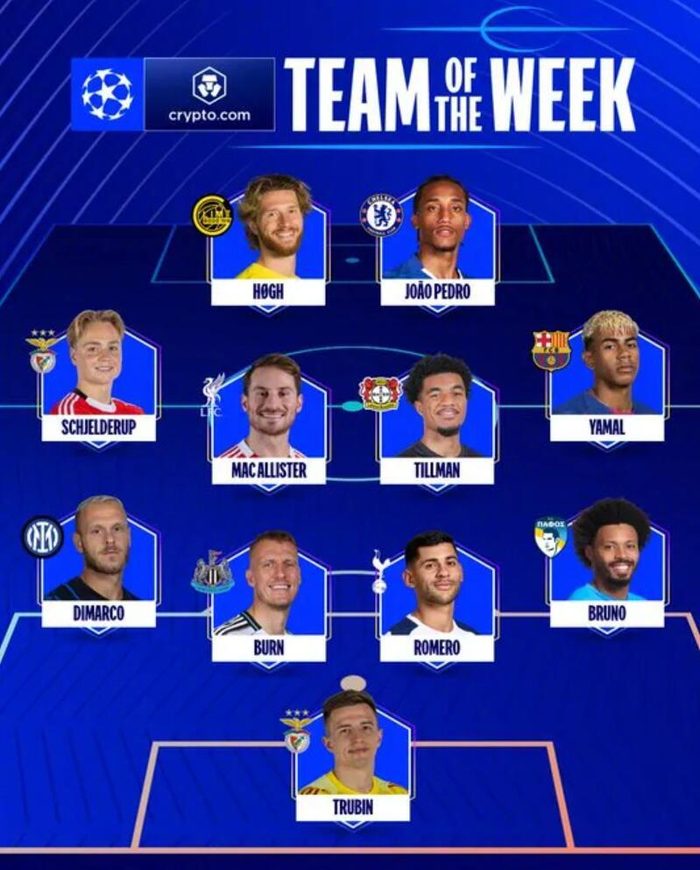 欧冠联赛阶段收官,官方公布本轮最佳阵容:
